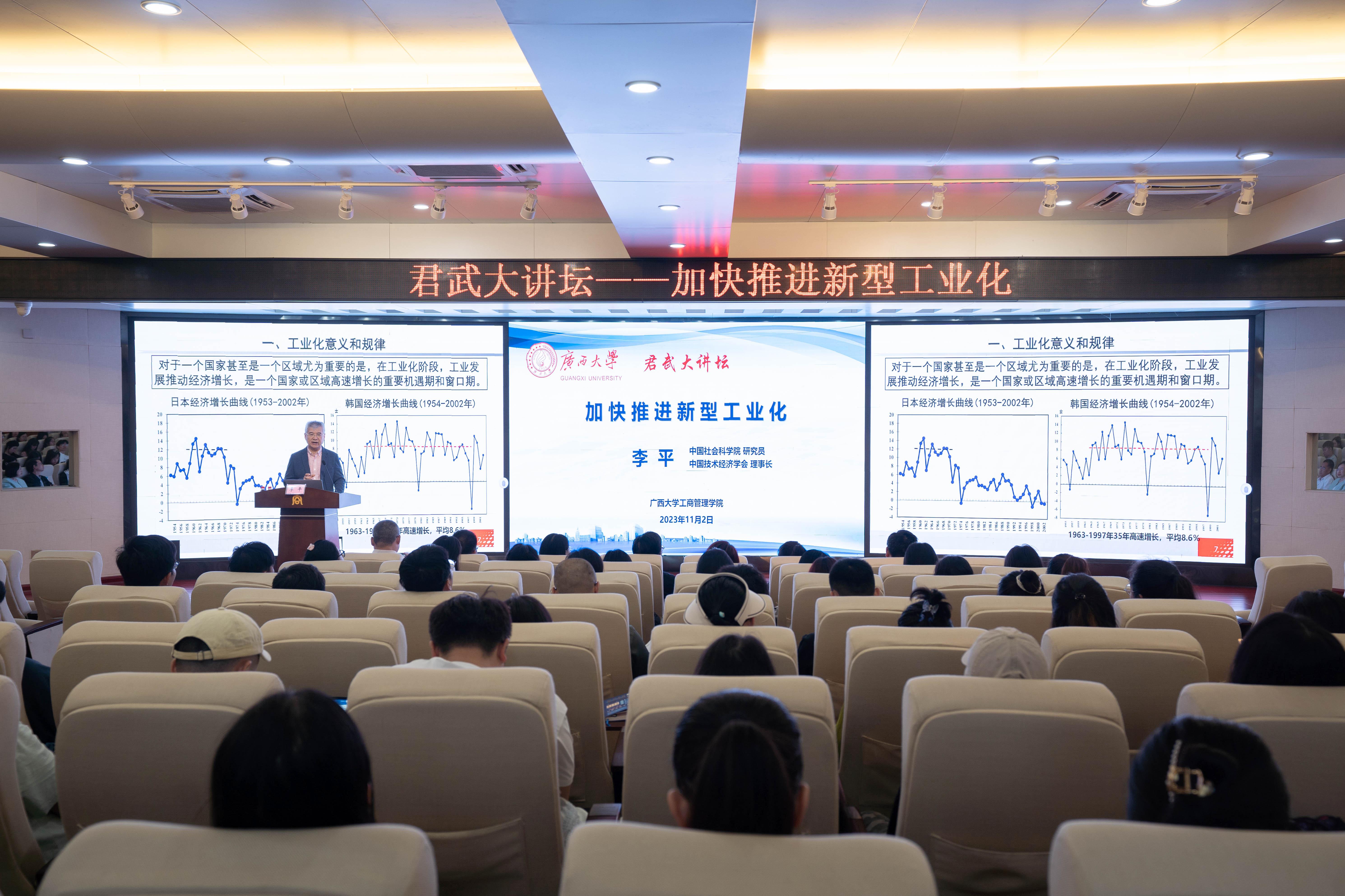 11月2日上午,中国技术经济学会理事长李平研究员做客公司承办的太阳成集团tyc411“君武大讲坛”,在太阳成集团tyc411128报告厅为师生们作题为“加快推进新型工业化”的专题报告。自治区科协党组成员、副主席朱其东;中国技术经济学会副秘书长、常务理事,中国社科院数经所研究员王宏伟;中国技术经济学会会员服务部主任、高级会计师何冰;太阳成集团tyc411科研院副经理、社会科学处处长刘培军;广西科技服务中心副主任盘健斌;中国技术经济学会科研助理李维嘉出席讲坛。学院全体专任教师以及部分博士生、硕士生到场聆听和学习交流。太阳成集团tyc411经理朱帮助主持讲坛。
